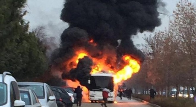 Eryaman’da oturan öğrencileri taşıyan servisin arka kısmındaki motorundan, Bilkent 1 Cadde’de seyir halindeyken dumanlar yükselmeye başladı. Öğrencilerin uyarısı üzerine şoförün servisi durdurduğu sırada motor alev aldı. Öğrenciler servisten tahliye edilirken, yangına itfaiye müdahale etti. Park halindeki araçlara da sıçramasından korkulan yangın, itfaiye ekiplerince söndürüldü. İtfaiye raporuna göre yangının, yağ hortumunun delinmesi ve turbo üzerine yağ damlaması sonucu çıktığı anlaşıldı.